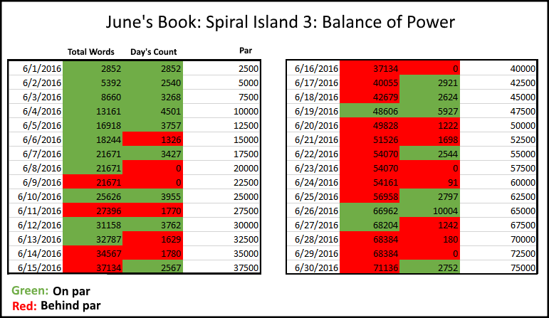 If I hadn't gotten as far as I did, though, I wouldn't have moved on. Starting with Spiral Island 1, as I mentioned, I had to make changes in the plot to make it work with the lore. This continued snowballing more through the course of writing Spiral Island 2. Because of all of this, the entire course of the trilogy had changed. The story and the events are still the same, pretty much, but the reasons why everyting happened, to make it all make sense, changed. Because of that, because the way the third book progresses, if I hadn't figured out how the climax of book two was set once I hit June I wouldn't have been able to start the third one and would have had to continue writing it into June before I could start. Luckily, I was able to get it to a point I finally had an idea of the conclusion and everything was going with last minute writing on Memorial Day, so I was able to move on.